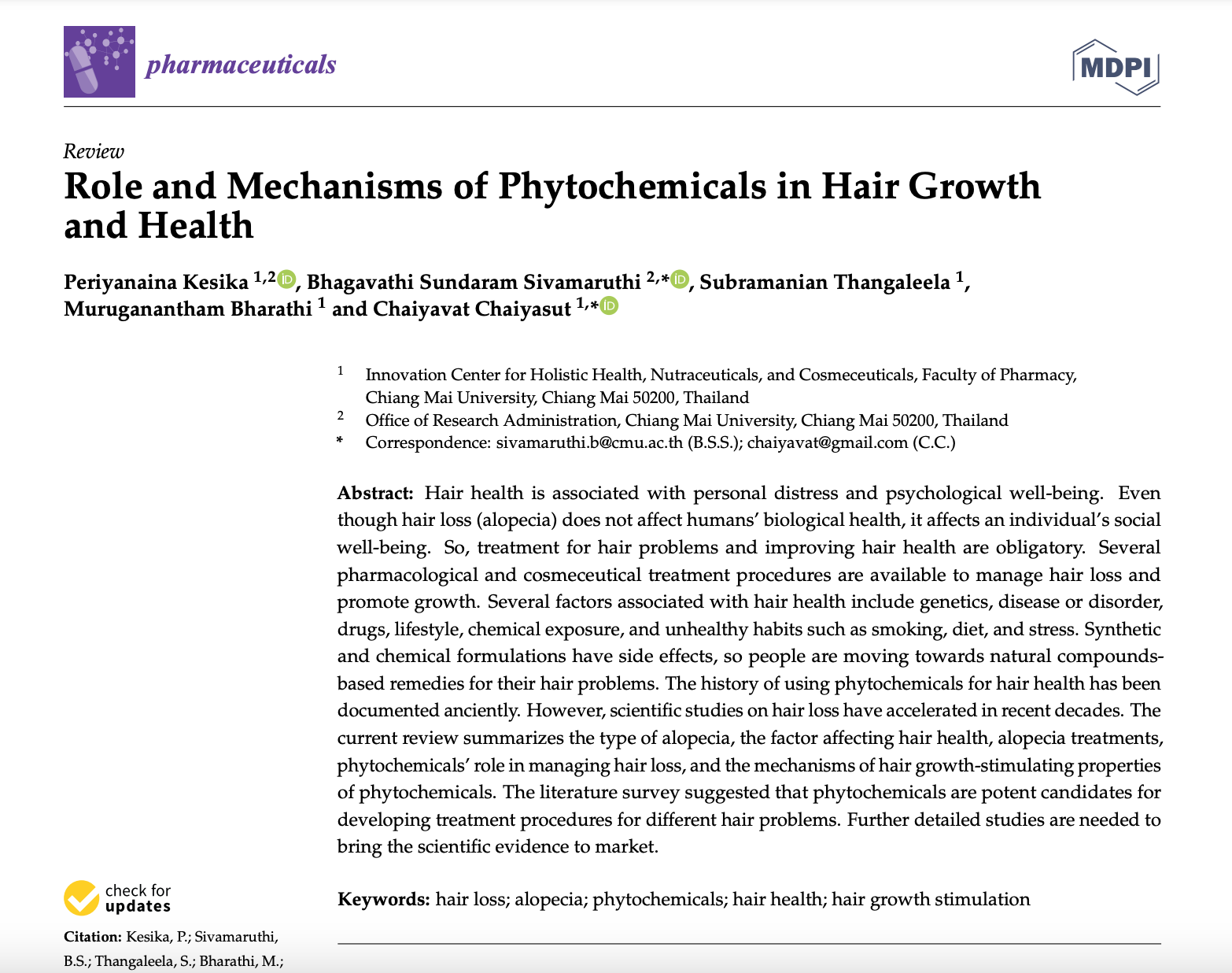 Kesika P, Sivamaruthi BS, Thangaleela S, Bharathi M, Chaiyasut C. Role and Mechanisms of Phytochemicals in Hair Growth and Health. Pharmaceuticals (Basel). 2023 Jan 30;16(2):206. doi: 10.3390/ph16020206. PMID: 37259355; PMCID: PMC9963650